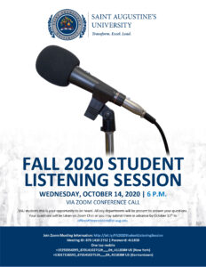 SAU students this is your opportunity to be heard. All key departments will be present to answer your questions. Your questions will be taken via Zoom chat or you may submit them in advance by October 12 to officeofthepresident@st-aug.edu Join Zoom here →